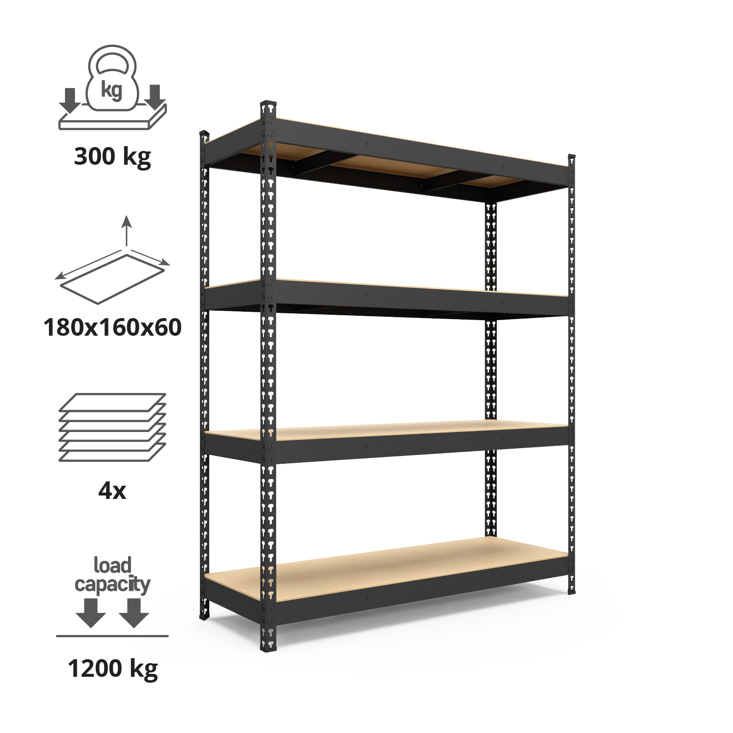 Das flexiblen Stecksystem erlaubt es, die Abstände zwischen den einzelnen Böden frei einzustellen. Die 4 Böden sind aus hochqualitativen MDF-Platten und haben eine Tragkraft von jeweils 300 kg bei einer gleichmäßigen Gewichtsverteilung. Mit einer Belastbarkeit von insgesamt 1200 kg ist das Schwerlastregal für die Lagerung von einem breiten Spektrum an Utensilien optimiert. Der Anschluss an weitere Titan-Modelle kann problemlos erfolgen.
