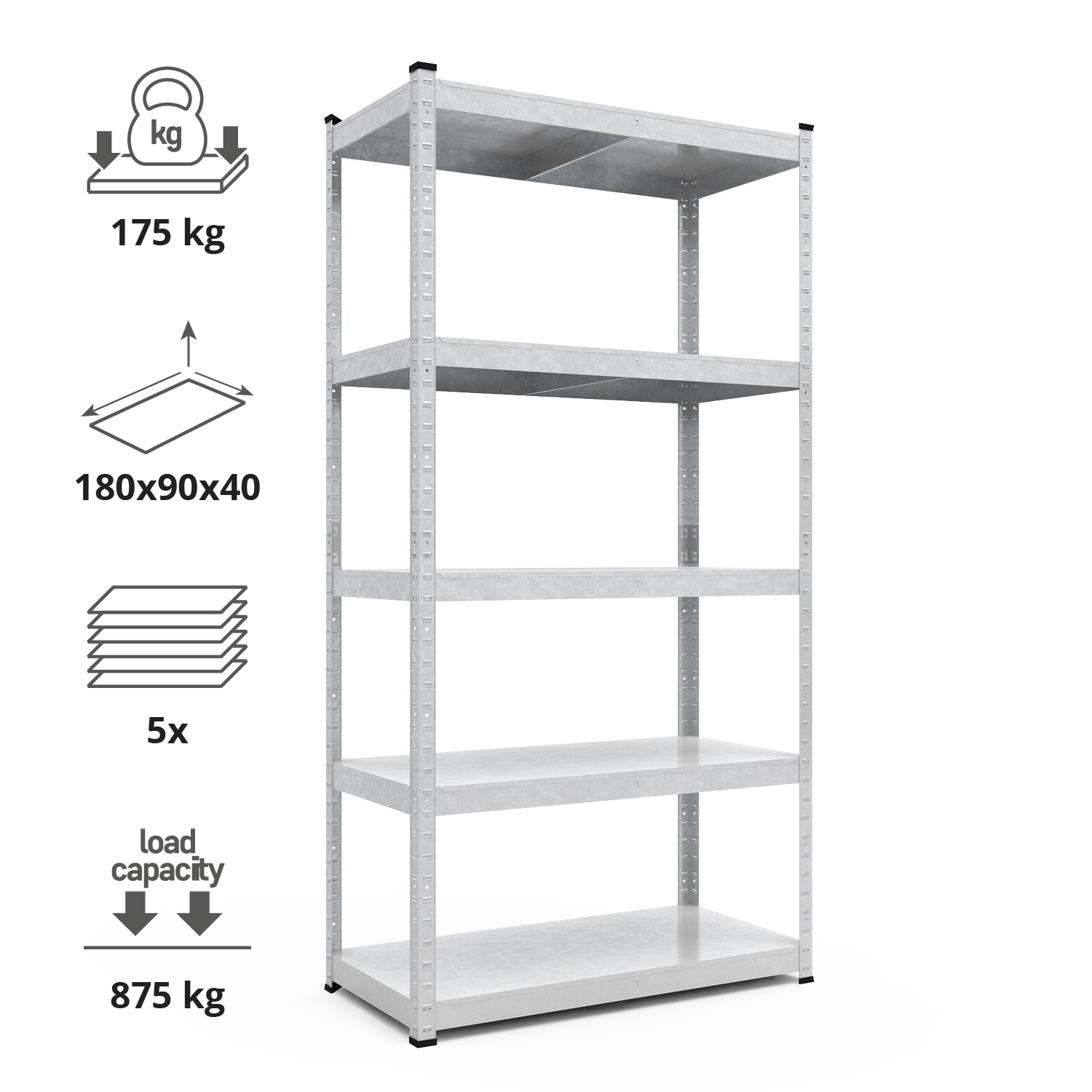 Das flexiblen Stecksystem erlaubt es, die Abstände zwischen den einzelnen Böden frei einzustellen. Die 5 Böden sind aus hochqualitativen Metall-Platten und haben eine Tragkraft von jeweils 175 kg bei einer gleichmäßigen Gewichtsverteilung. Mit einer Belastbarkeit von insgesamt 875 kg ist das Steckregal für die Lagerung von einem breiten Spektrum an Utensilien optimiert. Der Anschluss an weitere Budget-Modelle kann problemlos erfolgen.